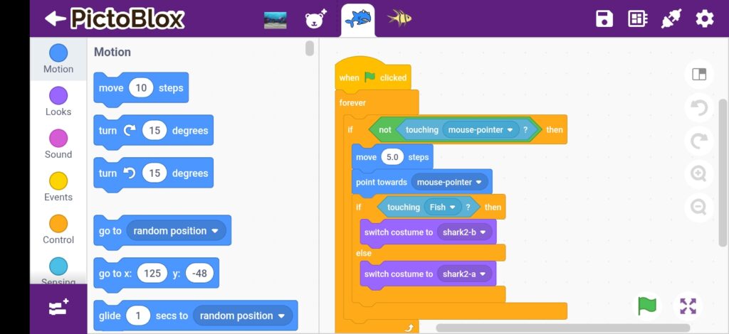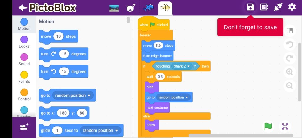 move (3) steps(Kecepatan lebih lambat dari hiu agar bisa terkejar).if on edge, bounce(Agar tidak hilang dari layar).if (pick random 1 to 10) = 1 then->turn right (pick random -20 to 20) degrees(Ini membuat gerakan ikan terlihat alami dan tidak kaku).