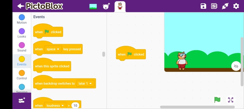 Tarik blok “when green flag clicked” ke area kerja (Script Area).