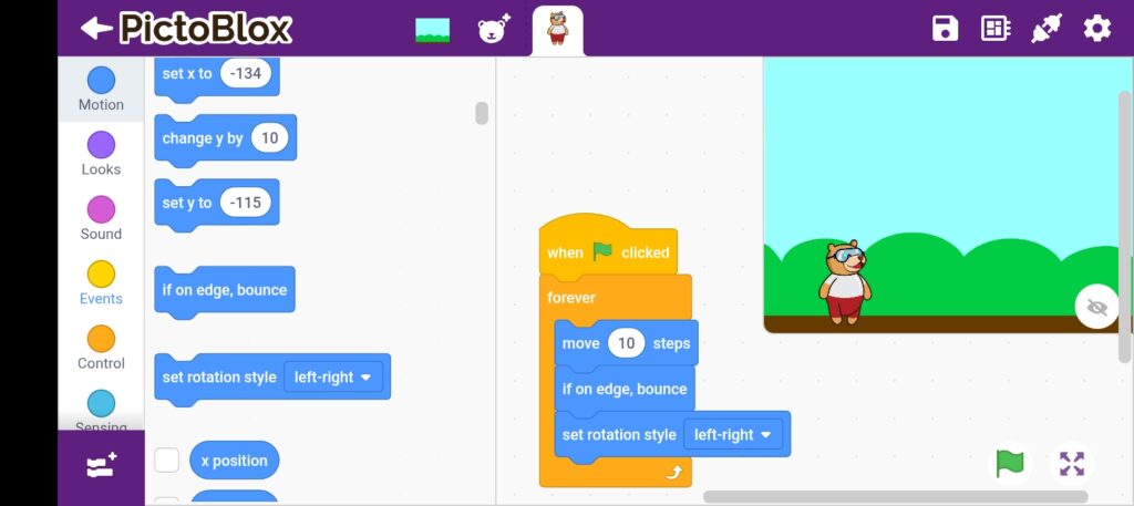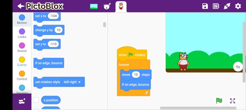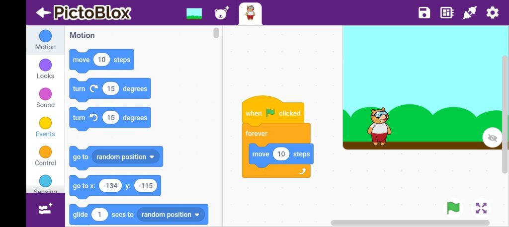 Dalam tutorial ini, kita akan membuat Tobi (karakter beruang panda yang merupakan maskot PictoBlox) bergerak maju saat kita menekan ikon Bendera Hijau.